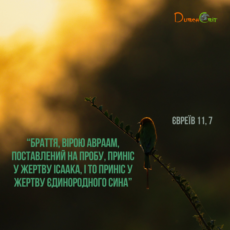 Євреїв 11, 7: “Браття, вірою Авраам, поставлений на пробу, приніс у жертву Ісаака, і то приніс у жертву єдинородного сина”