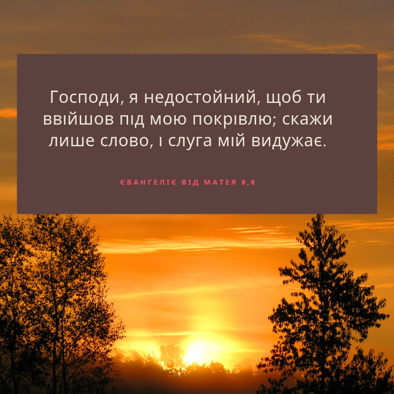 – Господи, я недостойний, щоб ти ввійшов під мою покрівлю; скажи лише слово, і слуга мій видужає. 9. Бо і я підвладний чоловік, маю вояків під собою і кажу цьому: – і він іде; і тому: ходи – і він приходить; і слузі моєму: зроби це – і він робить.