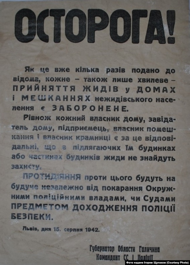 «Осторога!» Листівка, 15 серпня 1942роаку, з експозиції Музею «Пам’ять єврейського народу та Голокост в Україні», м. Дніпро