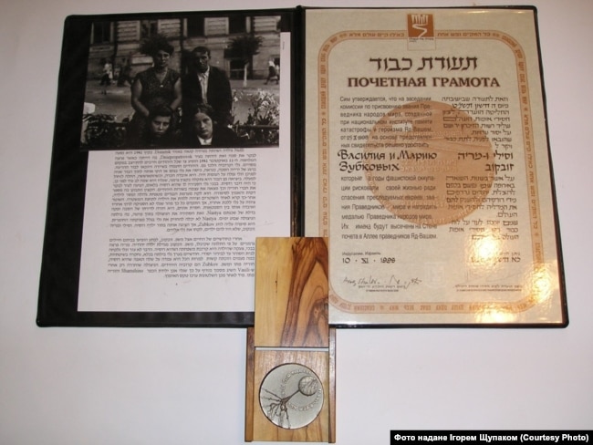 Любов Карпінська тримає найвищу нагороду дідуся і бабусі за порятунок єврейки Мані (Марії) Ребхан