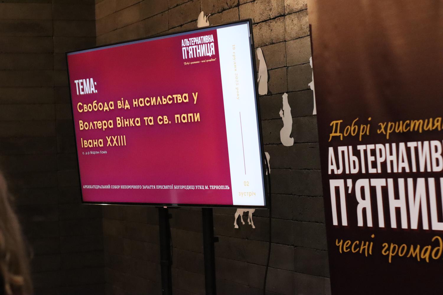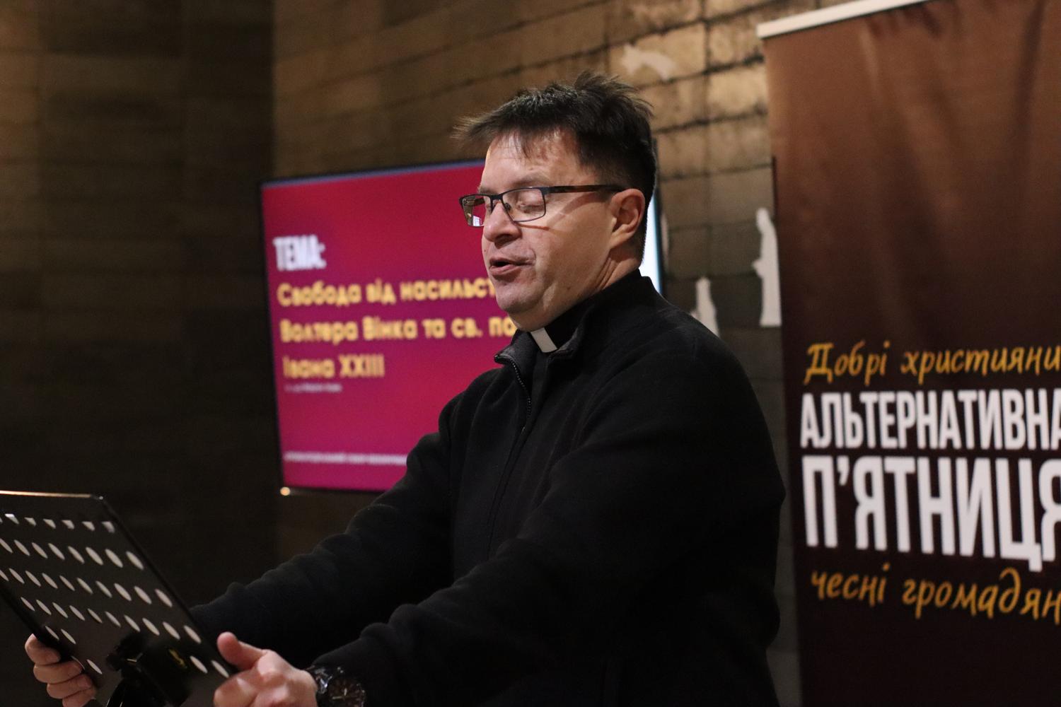 Чергова зустріч в рамках Альтернативної п'ятниці "Добрі християни - чесні громадяни" розкрила євангельський шлях свободи від насильства у світлі вчення Волтера Вінка та св. папи Івана ХХІІІ. Доповідав на зустрічі доктор церковного права, випускник Інституту Архангела Гавриїла, школи церковної дипломатії та комунікації, священник Архикатедрального Собору Непорочного Зачаття Пресвятої Богородиці м. Тернопіль отець Мартин Хомів.