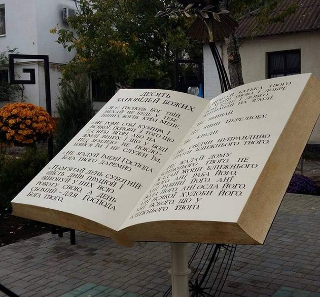 На кам'яних скрижалях «10 Заповідей» подаються в оригінальній версії, зокрема, йдеться про "день суботній", хоча зараз для християн, на відміну від старозавітніх людей, відпочинковим і святим днем є неділя.